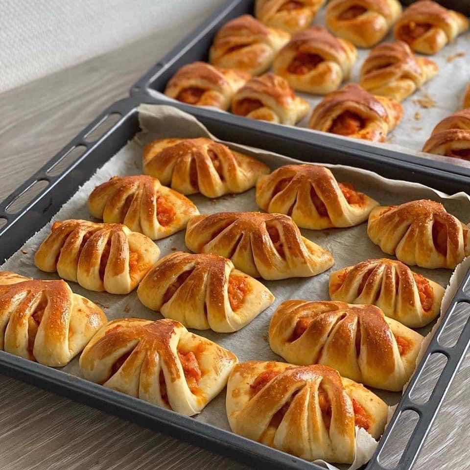 مكونات العجينه كيلو طحين ملعقه كبيره خميره ملعقه وسط ملح ملعقه وسط سكر ملعقه كبيره زيت ربع كوب حليب دافء كوب ٢ ماء دافء الحشو حسب رغبتكم تعجن المواد وتترك ترتاح وتشكل مثل الصورتدهن بالحليب وأصفر البيض والى الفرن 🔥